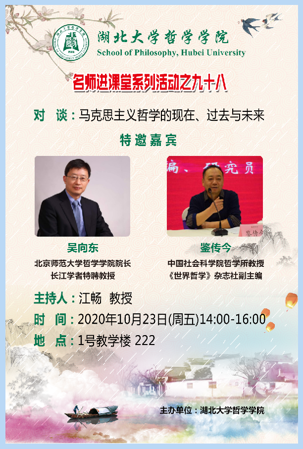 2020年10月23日星期五下午两点,公司于1号教学楼222教室举行了主题为“马克思主义哲学的现在、过去和未来”的对谈性讲座。此次讲座由江畅教授主持,北京师范大学太阳成集团tyc234cc主页经理、国家级计划入选者特聘教授吴向东教授及《世界哲学》杂志社副主编、中国社会科公司哲学所鉴传今教授应邀出席讲座。出席此次会议的还有公司党委书记戴茂堂教授、陶文佳讲师,以及华中科技大学副教授林季杉老师。公司部分硕士和博士也积极地参与了这次讲座。