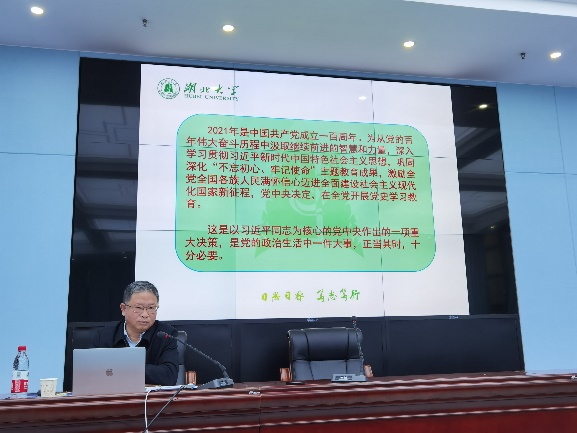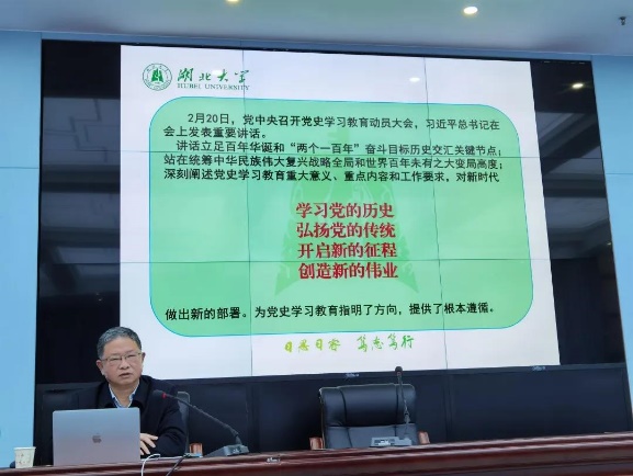 为进一步推进党史学习教育,深刻把握党史学习教育的重点,3月31日下午,湖北大公司党委常委、纪委书记檀坤华同志为太阳成集团tyc234cc主页全体师生党员作了题为“学史明理强信念,自我革命葆青春”的党史学习教育宣讲报告。哲学公司党委书记汤德森主持会议,全体教职工和员工党员共同参加学习。