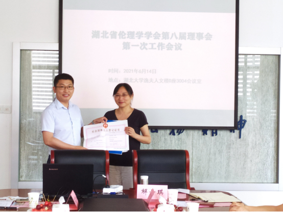 2021年6月14日上午,湖北省伦理学学会在太阳成集团tyc234cc主页召开了第八届理事会第一次工作会议。会议由戴茂堂会长主持,来自武汉大学、华中科技大学、华中师范大学、中南财经政法大学等高校的会员代表以及北京国信启迪人才服务有限公司董事长彭保林参与了本次会议并对学会未来的工作提出了十分有价值的建议。