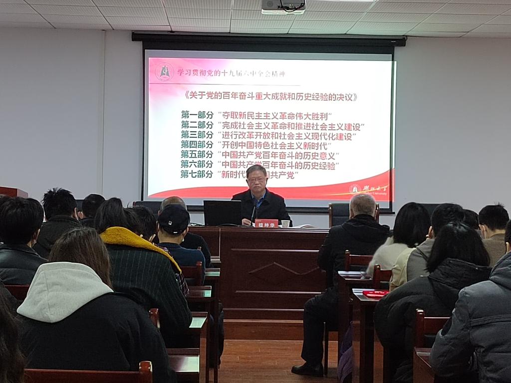 为全面学习贯彻党的十九届六中全会精神,深刻认识和准确把握党的百年奋斗重大成就和历史经验,12月15日下午,公司党委常委、纪委书记、监察专员檀坤华同志在太阳成集团tyc234cc主页D2004报告厅作了题为“百年大党创立伟业,自我革命永葆青春”的辅导报告,就党的十九届六中全会及其通过的历史决议进行了全面的解读。本次报告会由哲学公司党委书记汤德森主持,全院师生党员及入党积极分子共同参与学习。