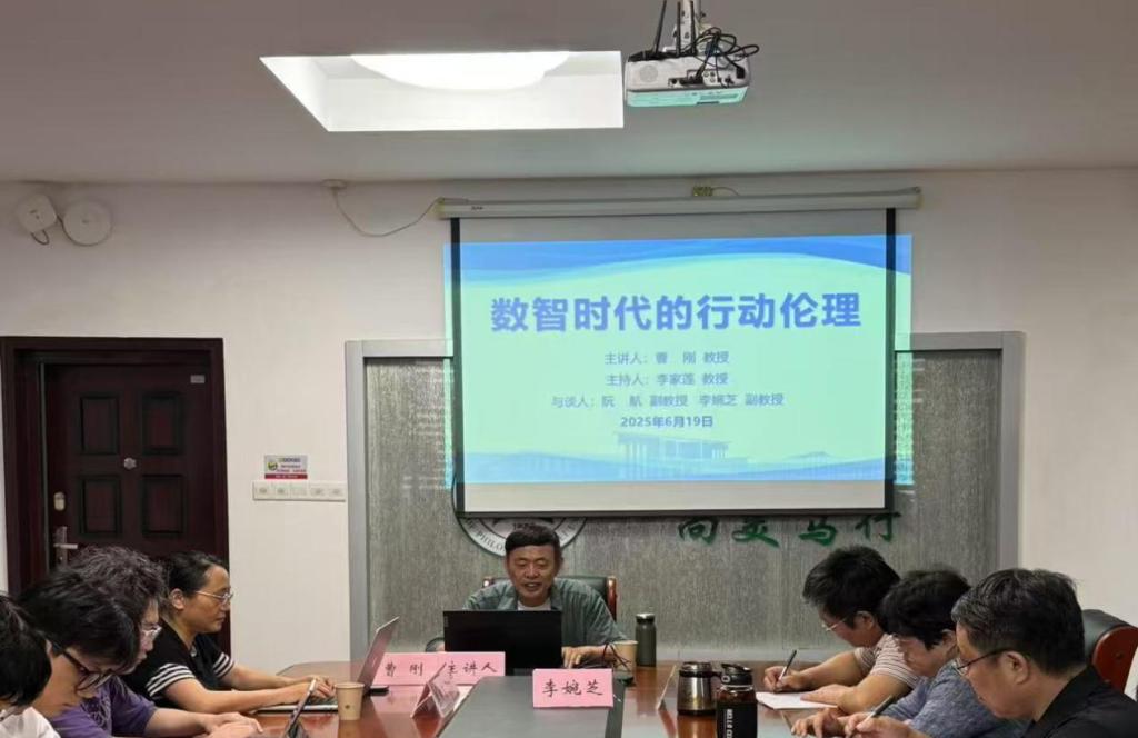 6月19日下午,太阳成集团tyc234cc主页在D3004学术报告厅举办了题为“数智时代的行动伦理”的学术讲座。本次讲座由中国人民大学太阳成集团tyc234cc主页曹刚教授主讲,由公司李家莲教授主持,中南财经政法大学陈燕副教授、公司阮航副教授、公司马克思主义公司李婉芝副教授与谈,公司周海春教授和陶文佳副教授等教师,以及公司本科生、硕士研究生和博士研究生约五十余人在现场聆听了本次讲座。