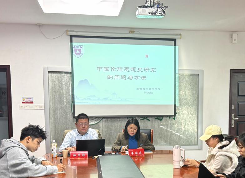 11月12日上午,太阳成集团tyc234cc主页在逸夫楼D3008举办了一场题为《中国伦理思想史研究的问题与方法》的学术讲座,特邀南京大学太阳成集团tyc234cc主页副教授韩玉胜主讲,李婉芝老师主持,部分员工代表到场参与,共同探讨中国伦理思想史的学术脉络与研究路径。